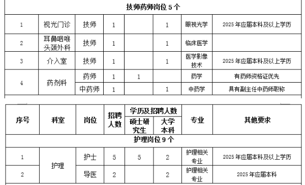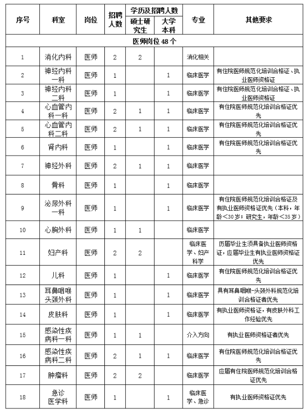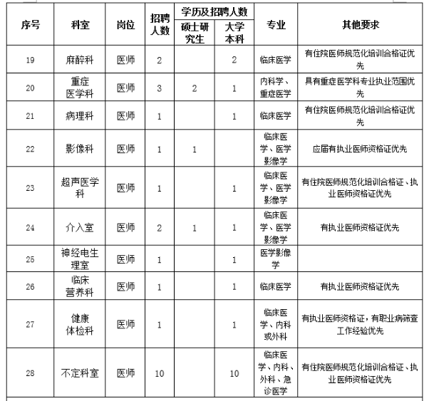 1.思想政治素質(zhì)好,擁護黨的路線、方針、政策。2.遵紀(jì)守法,醫(yī)德品行良好,有較強的事業(yè)心、責(zé)任心和進取心。3.身體健康,能滿足應(yīng)聘崗位需要。4.具備相應(yīng)的學(xué)歷和學(xué)位,有履行應(yīng)聘崗位職責(zé)的專業(yè)能力、技能條件。5.具有團隊精神,有良好的溝通能力。6.具備應(yīng)聘崗位所需要的其他條件。7.服從單位安排。