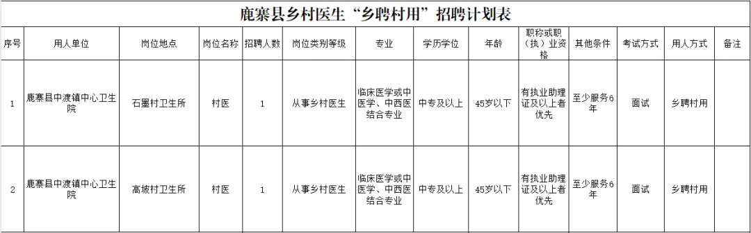 因工作需要,我院擬向社會公開招聘鄉(xiāng)村醫(yī)生2名,現(xiàn)將有關招聘事項公告如下: