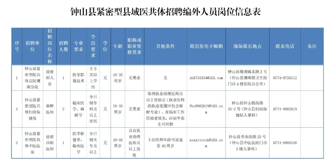 5.崗位具體信息及要求詳見(jiàn)附件1《鐘山縣緊密型縣域醫(yī)共體招聘編外人員崗位信息表》(如下圖)。