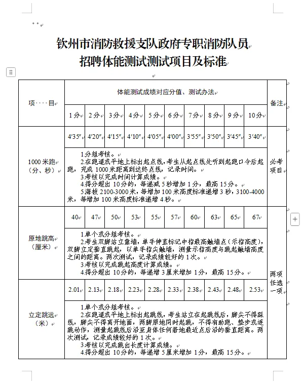 2.體能測試:(1)必考項(xiàng)目:1000米跑;(2)選考項(xiàng)目:①立定跳遠(yuǎn)、原地跳高二選一;②單杠引體向上、俯臥撐二選一;③10米×4往返跑、100米跑二選一;(3)注意事項(xiàng):應(yīng)聘人員須參加體能測試,并當(dāng)場簽訂《體能測試健康安全風(fēng)險承諾書》,體能測試有兩項(xiàng)及兩項(xiàng)以上不得分的視為不合格(標(biāo)準(zhǔn)參照附件)。未按時參加或因身體原因無法測試者,視為自動放棄。(體能測試測試項(xiàng)目及標(biāo)準(zhǔn)附后)